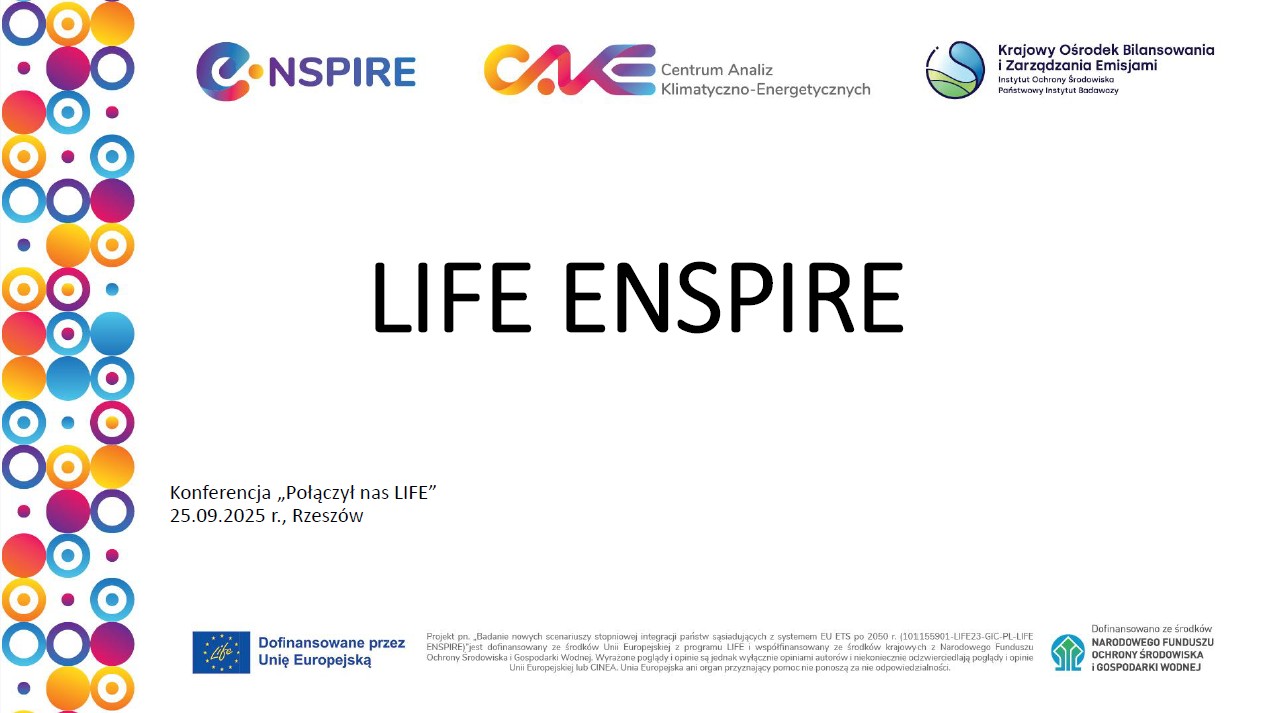 W dalszej części wystąpienia prelegentka wskazała główne cele projektu LIFE ENSPIRE, obejmujące opracowanie analiz dotyczących możliwości rozwoju oraz wpływu systemu handlu emisjami na Polskę, państwa członkowskie Unii Europejskiej, a także kraje sąsiadujące z UE – w kontekście realizacji międzynarodowych zobowiązań klimatycznych.