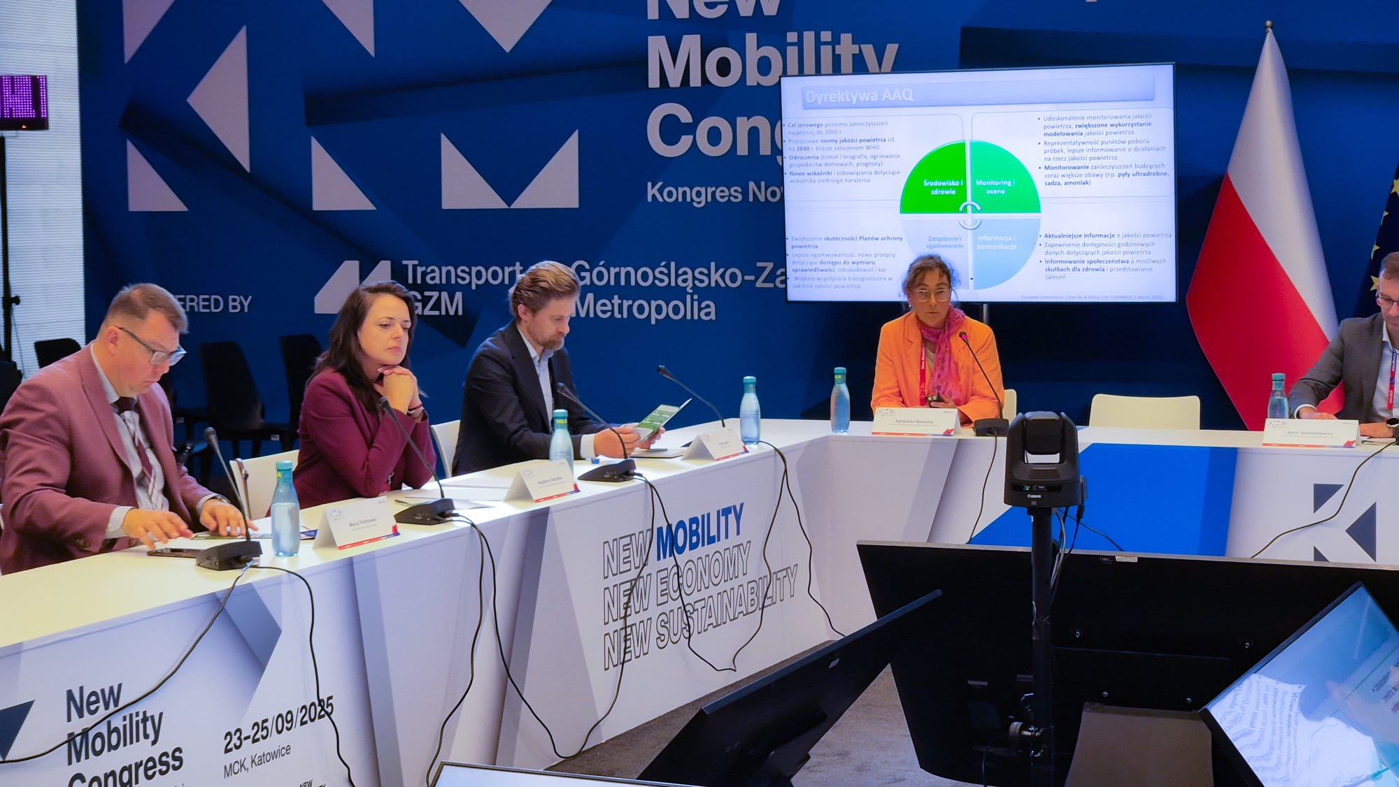- Blanka Jędrzejewska - Urząd Metropolitalny Górnośląsko-Zagłębiowskiej Metropolii – przedstawiła wyzwania metropolitalne i rolę transportu między miastami w poprawie jakości powietrza. Przedstawiła dotychczasowe działania GZM, takie jak budowa ścieżek rowerowych czy wprowadzanie ograniczeń prędkości, a także badania określające skalę problemu np. pomiary stężeń NOX wykonywane za pomocą samplerów. Wg nowych norm AAQD, które mają obowiązywać od 2030 r. w większości punktów pomiarowych odnotowano by przekroczenia rocznych stężeń. P. B. Jędrzejewska podkreśliła również potrzebę elastycznego podejścia dla metropolii, które funkcjonują ponad granicami gmin i wymagają szerszych działań (pomysł zmiany ustawy o elektromobilności).