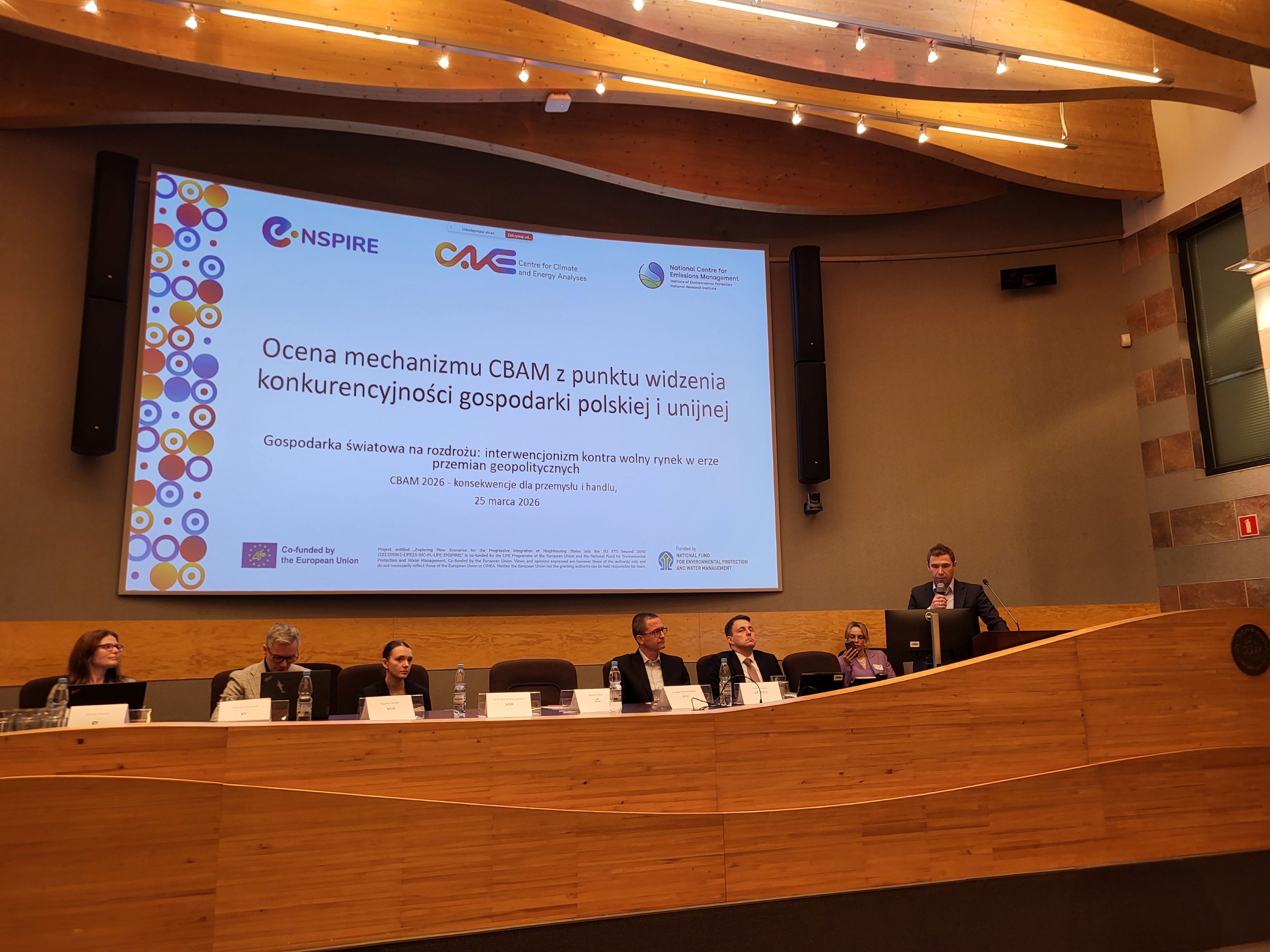 W panelu „Ocena mechanizmu CBAM z punktu widzenia konkurencyjności gospodarki polskiej i unijnej” uczestniczył Maciej Pyrka, Kierownik Zespołu Strategii, Analiz i Aukcji w KOBiZE/CAKE, który wygłosił prezentację na temat „Gospodarka światowa na rozdrożu: interwencjonizm kontra wolny rynek w erze przemian geopolitycznych”. W panelu uczestniczyli również: Piotr Sikorski (Prezes Polskiej Unii Dystrybutorów i Przetwórców Stali), dr Krzysztof Księżopolski (SGH), Paulina Wojtal (SGH), Wojciech Zalewski (EY) oraz Grzegorz Krechowiecki (SPC), natomiast moderację dyskusji prowadziła Dorota Pokrop (EY). W trakcie wystąpienia Maciej Pyrka zaprezentował podstawowe założenia mechanizmu CBAM (Carbon Border Adjustment Mechanism), którego celem jest wyrównanie kosztów emisji CO₂ pomiędzy producentami unijnymi i zagranicznymi, a tym samym ograniczenie zjawiska ucieczki emisji (przenoszenia produkcji) oraz stworzenie bodźców do dekarbonizacji w krajach trzecich.